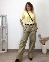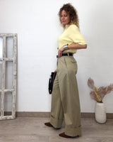 Pantalón amplio verde caqui. Corte amplio y recto terminado en vuelta la parte inferior. Bolsillos laterales Cinturilla con trabillas.