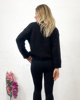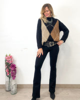 Pantalón negro acampanado con cinturilla de goma y tejido elástico y blandito.