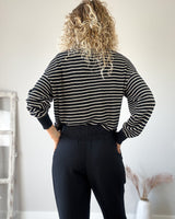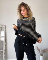 Pantalón amplio negro. Bolsillos laterales y cinturilla con goma en la parte trasera y cordón ajustable.