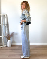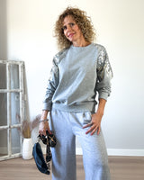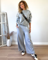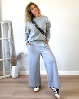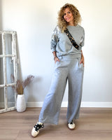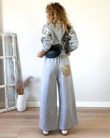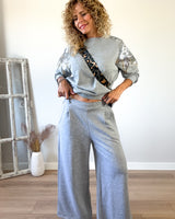 Pantalón largo gris de pierna ancha. Cinturilla de goma, bolsillos laterales y bolsillo trasero de lentejuelas doradas. Muy cómodo.