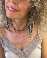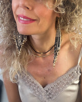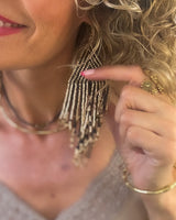 Pendiente grande y largo en forma de hilos con cuentas doradas y negras. Preciosidad hecha a mano.