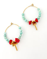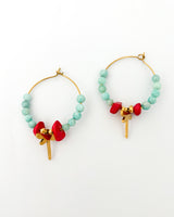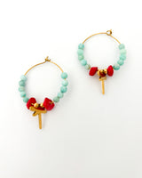Pendiente aro medio con piedra natural turquesa, charm libélula y piedras rojas.