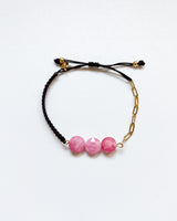 Pulsera de hilo y cadena con tres piedras rosas .Adaptable a varias medidas con terminación de bolitas.