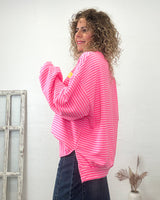 Sudadera de raya fucsia y rosa de corte recto larga y abertura en laterales. Una sudadera original y preciosa.