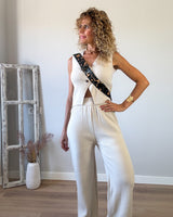 Pantalón beige de punto precioso con goma en la cinturilla y corte recto. Punto grueso.