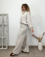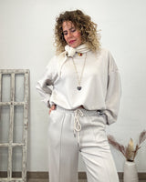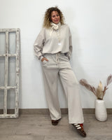 Conjunto beige casual de tejido elástico. Pantalón con cinturilla de goma y cordón. Corte recto y suelto con bolsillos laterales. Sudadera cuello redondo y corte abollonado con mucha caída.
