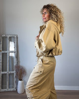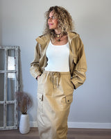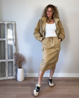 Conjunto cargo de falda y cazadora color camel. Falda con goma en la cinturilla, corchete y cremallera, bolsillos laterales y corte recto y amplio. Cazadora con bolsillos, capucha y cordón para ajustar.