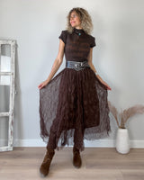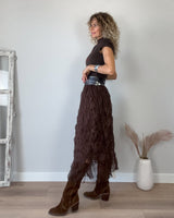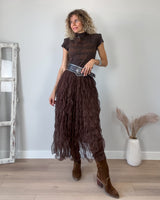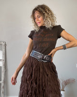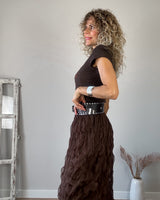 Falda larga de tul en color marrón chocolate. Tejido arrugado y forro interior negro. Una falda preciosa de tejido muy bonito.