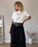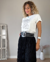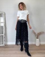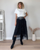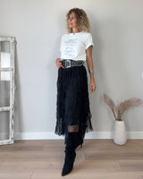 Falda larga de tul en color negro. Tejido arrugado y forro interior negro. Una falda preciosa de tejido muy bonito.
