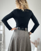 Falda larga jaspeada en negro y crudo. Cinturilla con goma trasera y corte suelto. Bolsillos laterales. Una falda preciosa de tejido muy bonito.