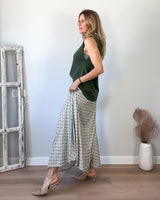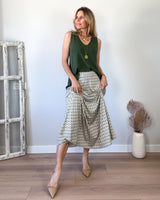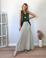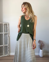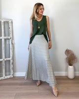 Falda larga con hojas verdes de punto frío con una preciosa caída y estampado geométrico. Una falda preciosa de tejido muy bonito.
