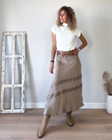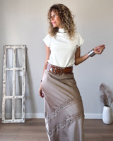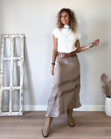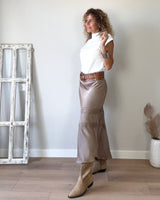 Falda larga satinada desigual color tostado champan. Corte de vuelo. Una preciosidad de falda tipo satén.
