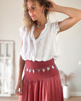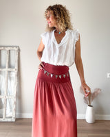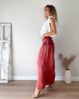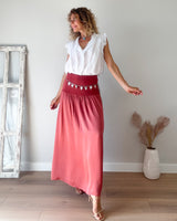 Falda larga satinada de color rosado. Preciosa caída y corte con vuelo. Cinturilla de goma ancha. Una falda preciosa de tejido muy bonito.