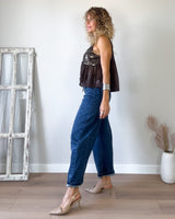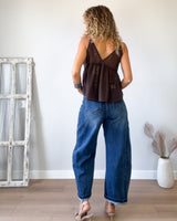 Jeans balloon azul oscuro de corte amplio y forma redondeada. Tejido elástico. Tiro medio.