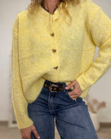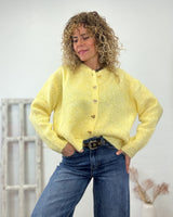 Chaqueta amsrillo de corte recto y botones en forma de corazón dorados.