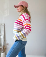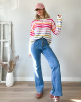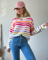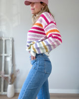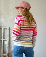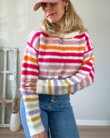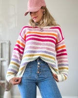 Jersey de rayas en colores fucsia, amarillo, malva y naranja. Corte recto y cuello redondo.