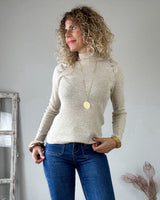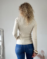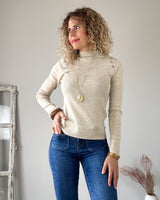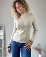 Jersey tostado de tejido muy agradable, punto fino. Combinado en los hombros con pieza de polipiel en crudo y tachuelas doradas. Cuello redondo.