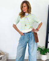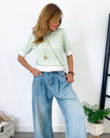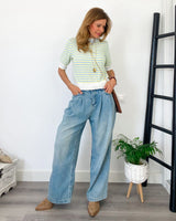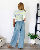Jeans azul claro de corte amplio y pinzas. Pierna ancha y tiro alto. Tejido muy blando y cómodo.