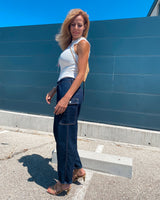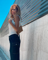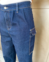 Jeans cargo baggy azul oscuro de corte amplio. Pierna ancha con bolsillos laterales.