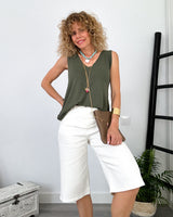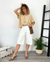 Jeans blanco por la rodilla de corte amplio. Pierna ancha y tiro alto. Tejido muy blando y cómodo.