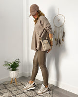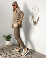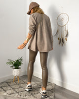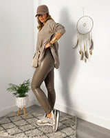 Pantalón polipiel en color topo. Cinturilla alta.