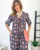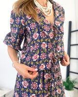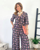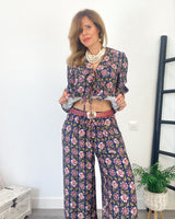 Blusa azul marino estampada con abertura de lazadas en parte delantera. Abullonada en las mangas de corte medio y fruncidas. Muy bonita y estilosa.