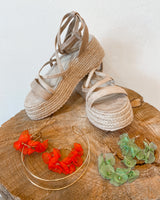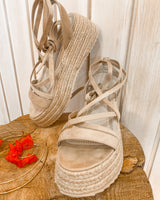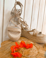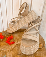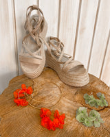 Sandalia color nude de tiras con suela de esparto con plataforma, abrochadas al tobillo. No pesan nada!!
