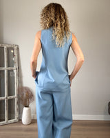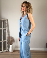 Conjunto pantalón y chaleco amarillo mantequilla. Pantalón con goma en la cinturilla, bolsillos laterales y corte recto. Chaleco de grandes botones y corte ajustado. Talla entre la 36 hasta la 38.