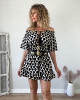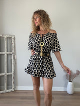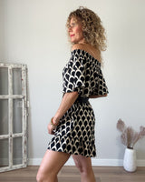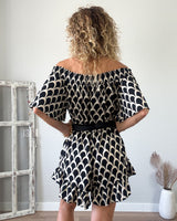 Mono corto negro y beige muy fluído engomado en los hombros. Volantes en la zona del pantalón.