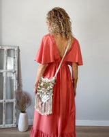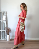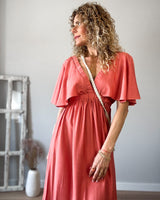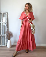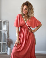 Vestido largo color teja con corte debajo del pecho. Escote pico delantero y trasero. Dos grandes volantes que tapan los hombros.