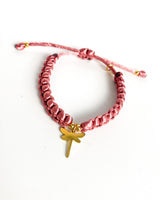Pulsera de hilos en color rosa con detalles en acero bañado en oro, charm de libélula. Adaptable a varias medidas con terminación de bolitas.