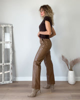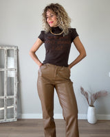Pantalón color moka de polipiel. Cinturilla con goma y ajuste. Bolsillos laterales y traseros.