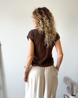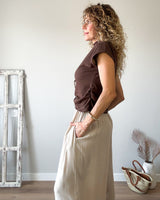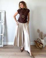 Pantalón tostado palazo de pierna ancha y precioso color. Muy fresquito con cinturilla de goma y muy cómodo.
