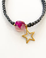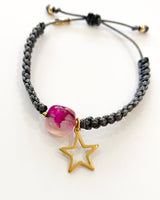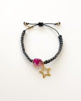 Pulsera de hilos en color gris con detalles en acero bañado, piedra de Agata y estrella. Adaptable a varias medidas con terminación de bolitas.