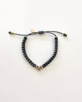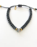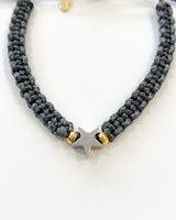Pulsera de hilos en color gris con detalles en acero y bolitas de acero bañado con estrella. Adaptable a varias medidas con terminación de bolitas.