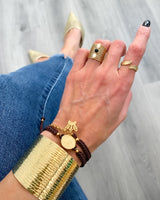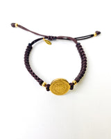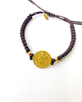 Pulsera de hilos en color chocolate con detalles en acero bañado. Charm de moneda. Adaptable a varias medidas con terminación de bolitas.