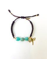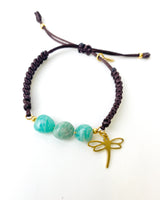 Pulsera de cinta en color chocolate con detalles en acero bañado. Charm de libélula, cadena y piedra natural verde. Adaptable a varias medidas con terminación de bolitas.