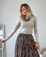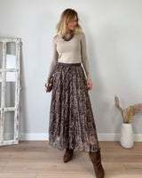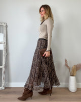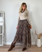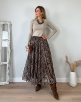 Falda larga de tul estampado de cachemir en color marrón chocolate y mostaza y tostados. Tejido arrugado y forro interior negro. Una falda preciosa de tejido muy bonito.