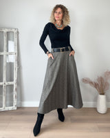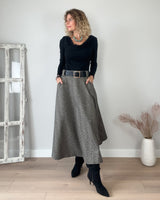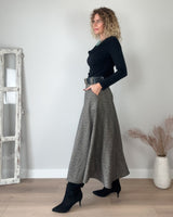 Falda larga jaspeada en negro y crudo. Cinturilla con goma trasera y corte suelto. Bolsillos laterales. Una falda preciosa de tejido muy bonito.