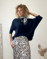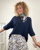 Jersey azul marino y cuello barco. Manga francesa ajustada tipo murciélago. Corte amplio.