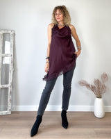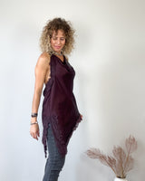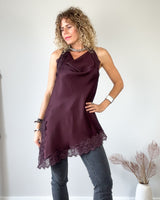 Top lencero berenjena con puntilla y corte pico. Cuello subido y espalda descubierta. Abertura lateral.