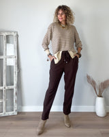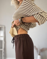 Pantalón amplio marrón chocolate. Bolsillos laterales y cinturilla con goma en la parte trasera y cordón ajustable.