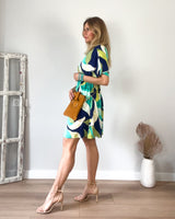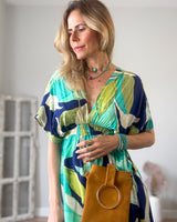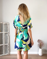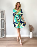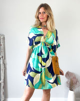 Vestido corto estampado en tonos turquesa, verde y marino. Escote pico delantero y trasero con goma. Cinturilla con goma. Dos pequeños volantes en los hombros.