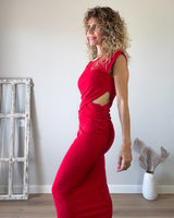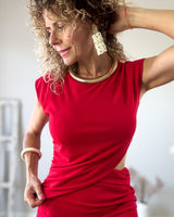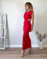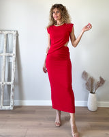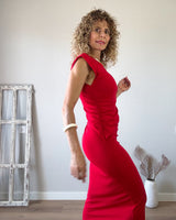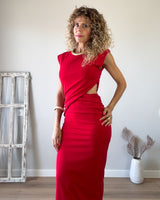 Vestido largo rojo con drapeado en la cintura. Escote redondo y pequeñas ma gas. Abertura en la parte lateral. Tejido muy elástico arrugadito. Corte ajustado.