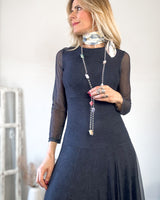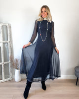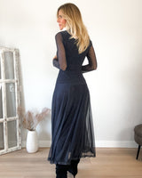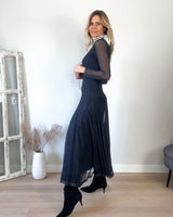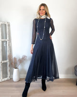 Vestido largo de tul en tonos azul y gris marengo. Corte ajustado en la parte superior. Forro interior y mangas semitransparentes.