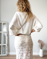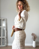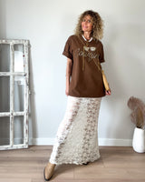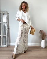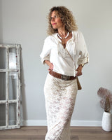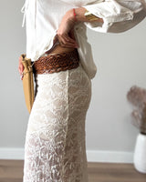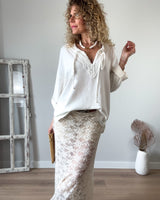 Falda larga beige de encaje y punto. Cinturilla con fina goma. Tejido suave.