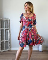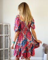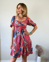 Vestido midi rosa fuerte con estampado colorido. Engomado en la espalda. Mangas con abullonadas con goma.