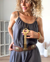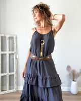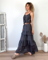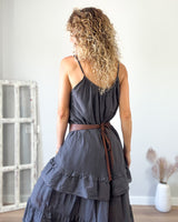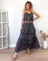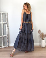 Vestido marrón chocolate oscuro con un ligero satinado. Un tejido muy bonito. Corte suelto y tirante fino. Forro interior.