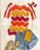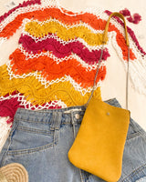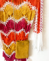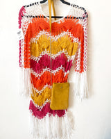 Vestido de crochet y flecos en color mostaza, blanco y fucsia. manga larga con flecos.