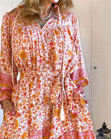 Vestido largo floral en color rosa, naranjas y crudos con pequeñas flores. Escote pico y abotonado hasta el pecho con lazada. Media manga con engomado en el puño. Corte amplio. Cinturón y bolsillos laterales.